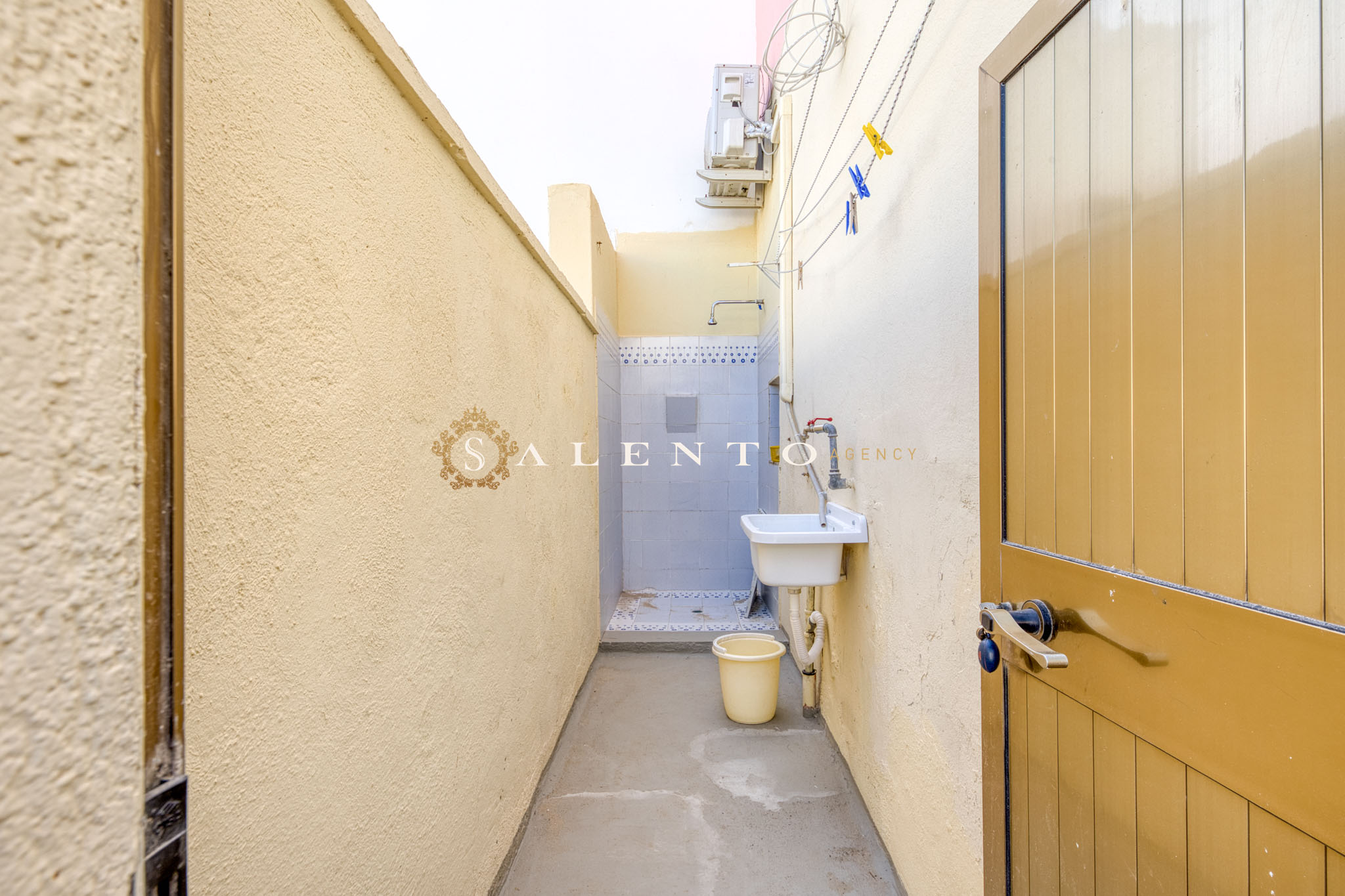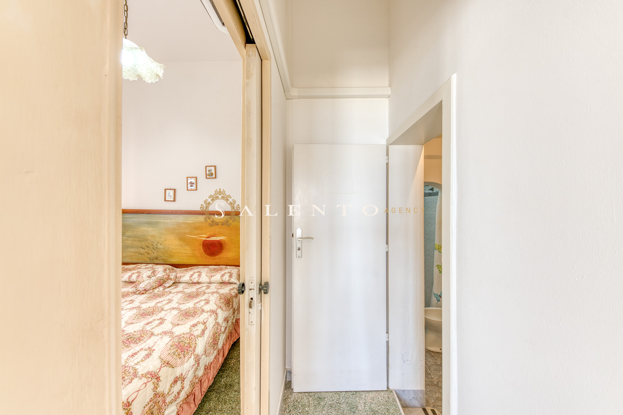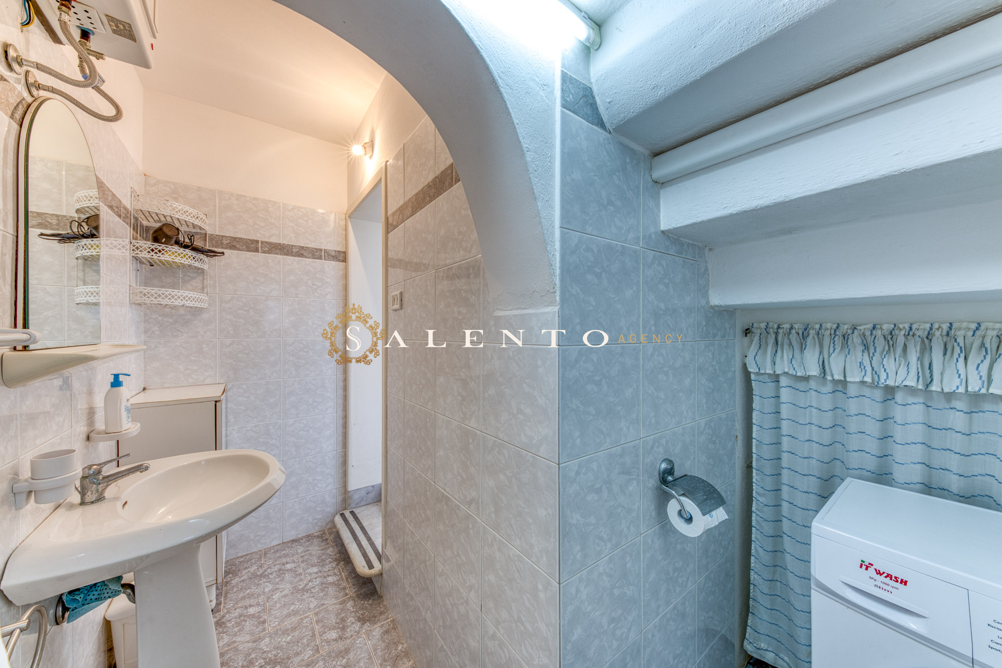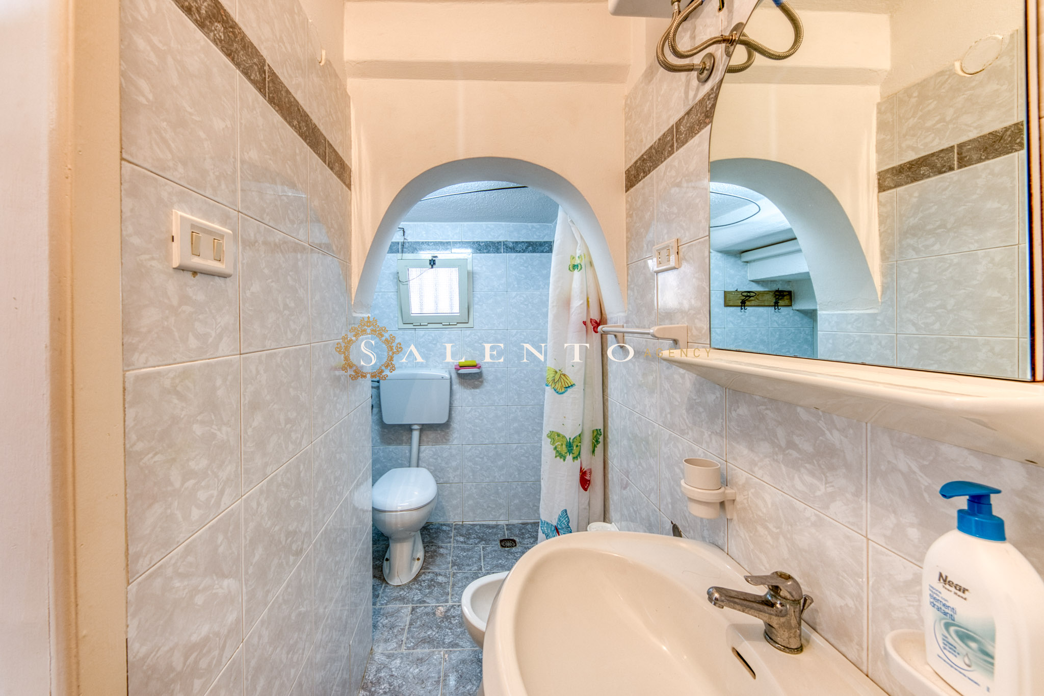 Il bagno di servizio, pur mantenendo finiture tradizionali e in buone condizioni di manutenzione, è funzionale e completo. Un valore aggiunto notevole è rappresentato dal piccolo scoperto di proprietà, separato dal corpo principale dell’abitazione ma essenziale per la vita di mare. In questo angolo esterno e riservato sono state predisposte una pratica doccia esterna, una lavatrice e un lavabo, perfetti per le esigenze post-spiaggia. Questo spazio può essere facilmente trasformato in un delizioso patio privato, un salotto all’aperto arricchito da piante mediterranee, diventando il luogo ideale per cene estive o momenti di totale relax.