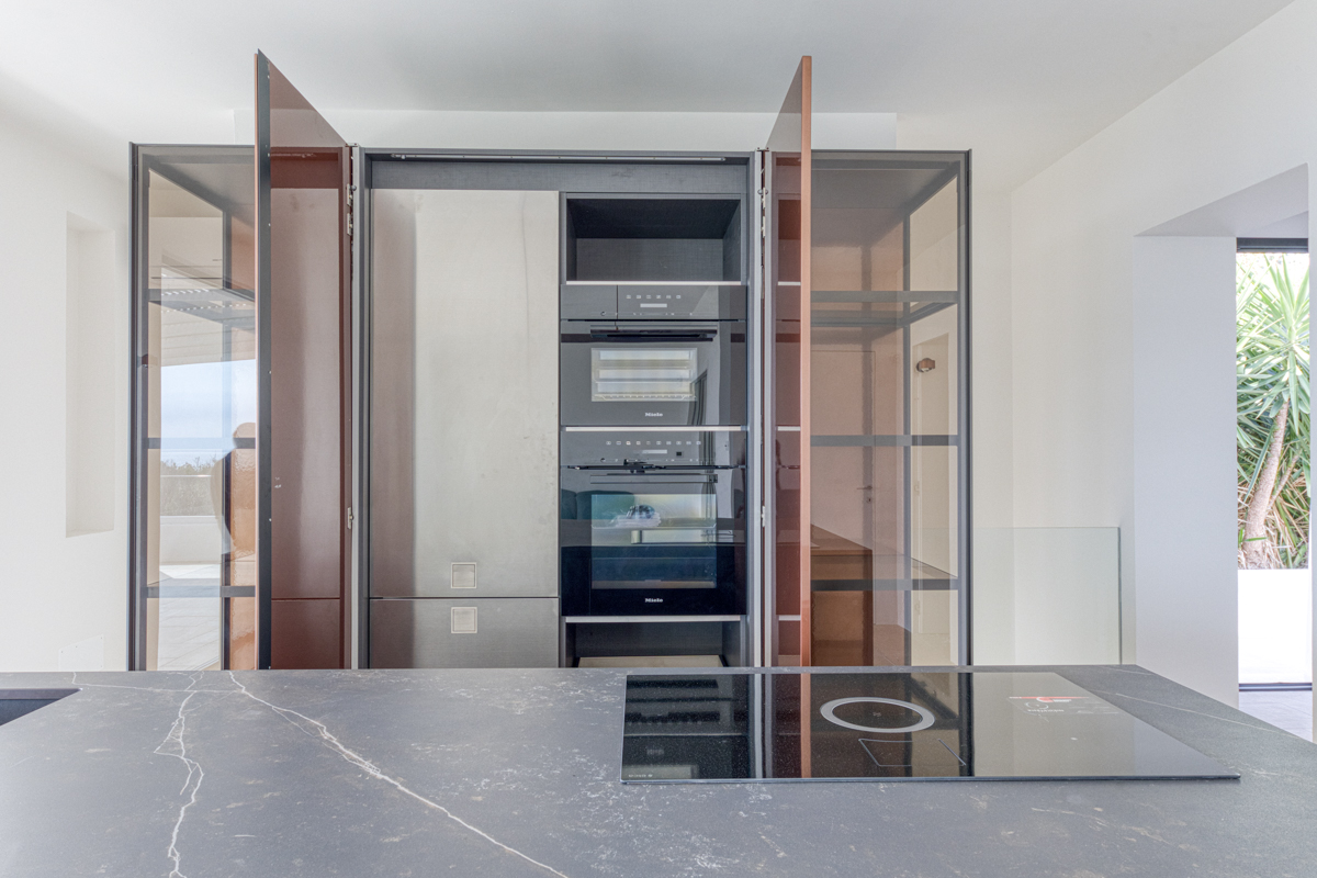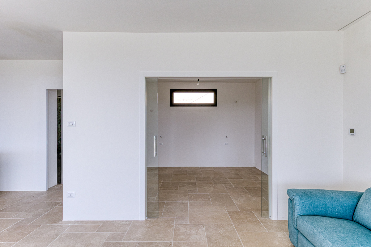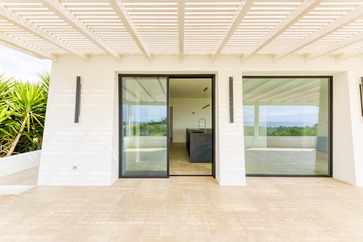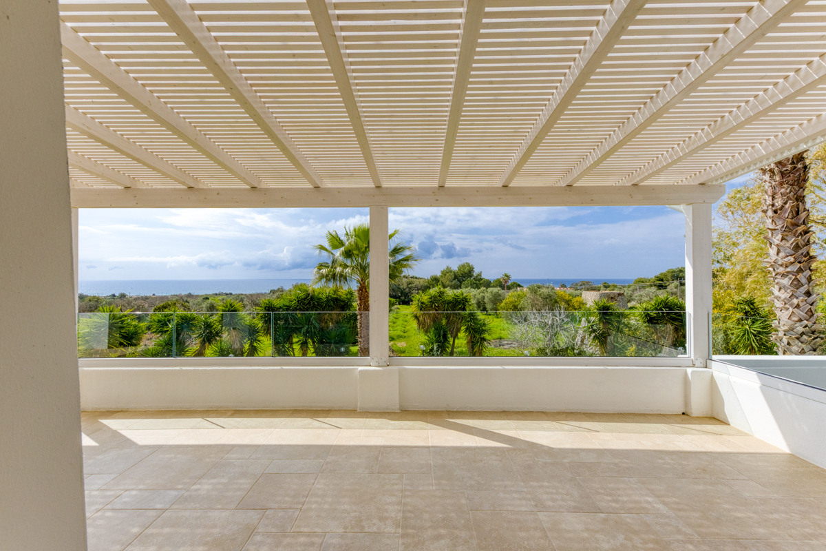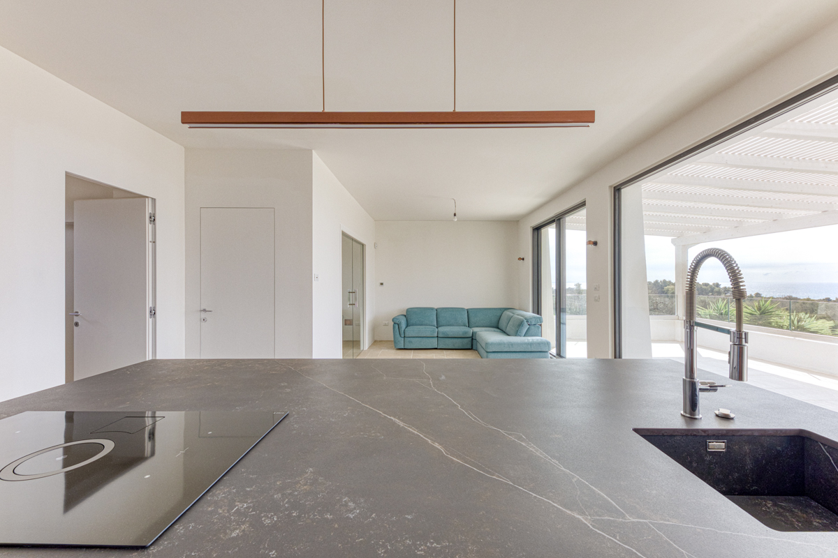 Uno degli elementi che rendono questo piano particolarmente affascinante è rappresentato dalle tre ampie vetrate che si affacciano direttamente sulla veranda esterna. Grazie a queste aperture di grandi dimensioni, gli ambienti risultano estremamente luminosi e offrono una continuità visiva tra interno ed esterno, permettendo di godere in ogni momento di una vista mare davvero suggestiva. La veranda diventa così un naturale prolungamento della zona giorno, uno spazio perfetto per rilassarsi all’aperto e contemplare il paesaggio circostante.