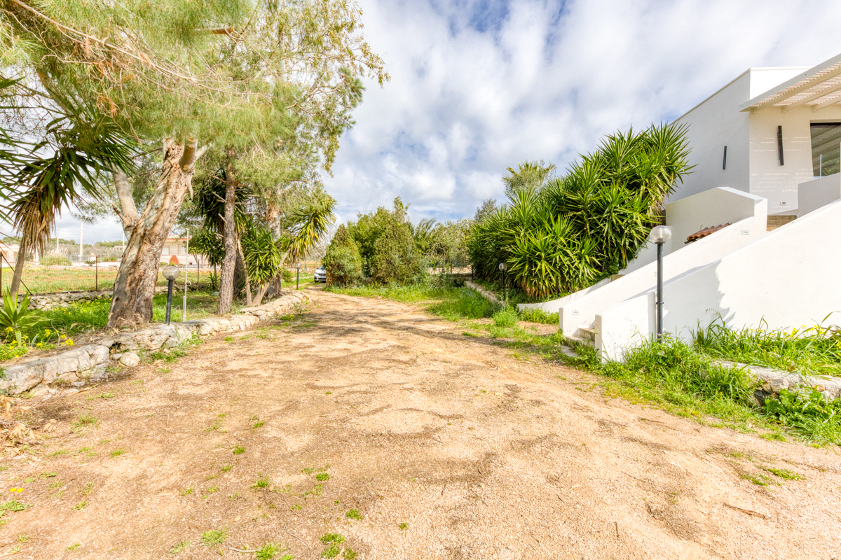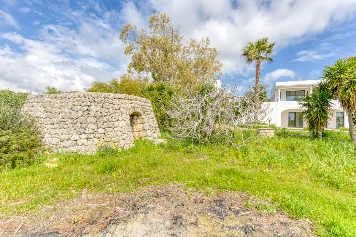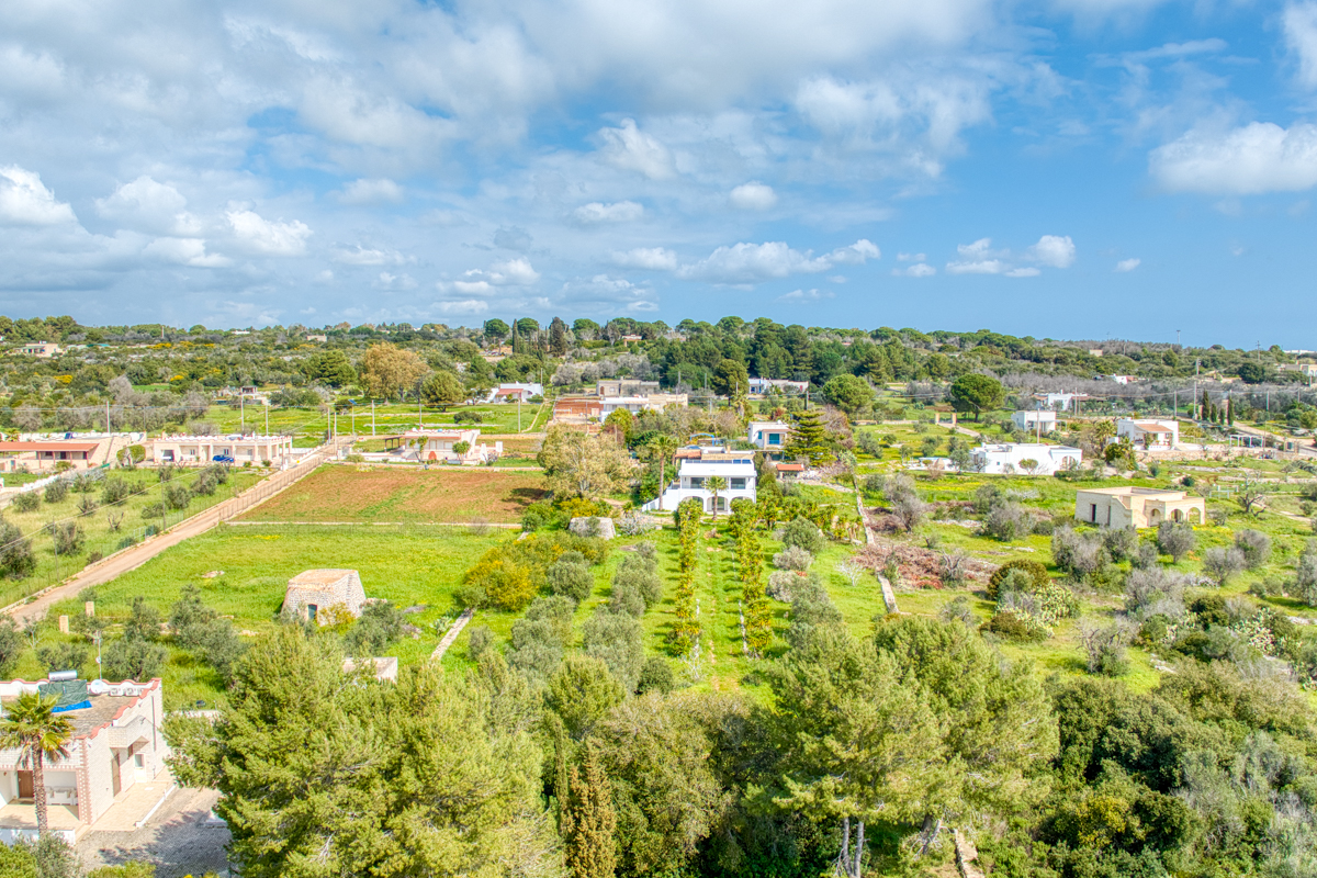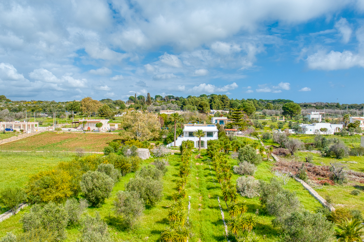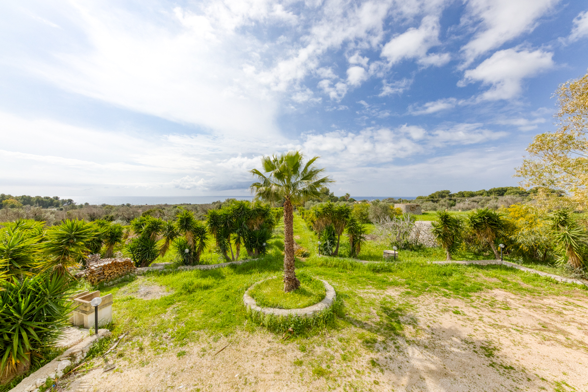 Il terreno che circonda la villa si estende per circa cinquemila metri quadrati ed è impreziosito dalla presenza di ulivi della varietà Leccino, resistenti alla Xylella, oltre a piante di fico e arbusti tipici della macchia mediterranea. La proprietà è dotata di sistema di subirrigazione per lo smaltimento delle acque reflue, di un pozzo ad uso domestico e di una cisterna per la raccolta dell’acqua potabile.